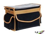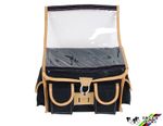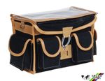 The lid opens on the handlebar side and closes with a hook and an elastic string allowing the rider to easily reach the contents of the bag while riding.
