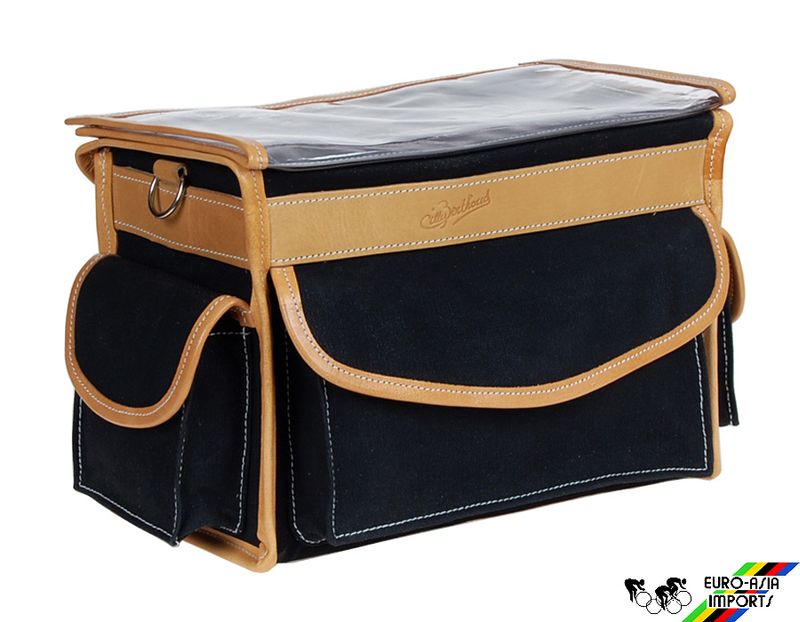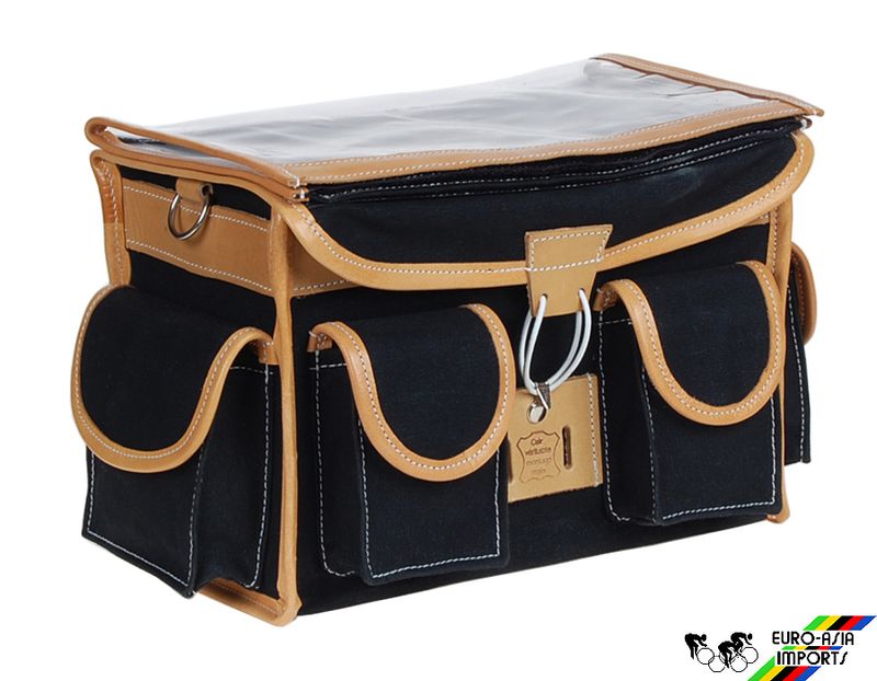Attaches with two leather straps to the handlebar or, better, with a "décaleur".