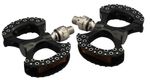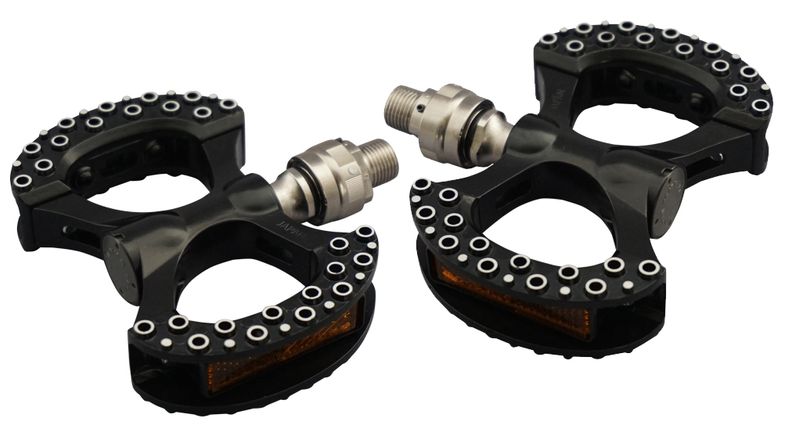 The Lambda Ezy Superior is an extremely unique double-sided platform pedal designed in conjunction with Rivendell Bicycle Works. The Lambda design uses a somewhat traditionally alloy pedal body attached to very unconventional alloy step block, and is built around our hand adjusted cup and cone bearing system. The large “C” shaped step blocks feature a octopus sucker like dimple that provides excellent grip without shoe damaging pins. While this pedal is quite large front to back, the unique design isn’t particularly wide allowing for ample clearance while cornering. Due to the large surface area, this pedal is popular for cycling in boots and fat biking.