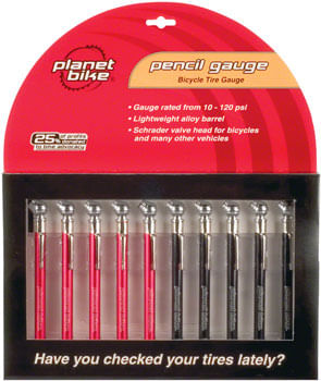 Planet Bike Pencil Gauges are made with lightweight alloy and rated from 10-120 psi.