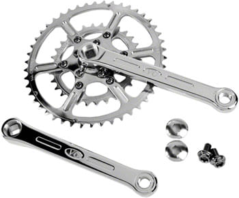 The Velo Orange Grand Cru 50.4 BCD Crankset is a modern reinterpretation of the classic aesthetic with several crucial enhancements. Crafted through cold forging from high-quality 7075 aluminum alloy, these cranks feature thicker rings to eliminate flex common in traditional designs. The outer rings are equipped with contemporary shifting aids like ramps and pins, markedly improving shifting performance. Chainring hardware is constructed from stainless steel and features allen head nuts/bolts. The alumnium dust caps and stainless crank bolts double as self-extracting crank hardware, adding a touch of efficiency to this upgraded classic.